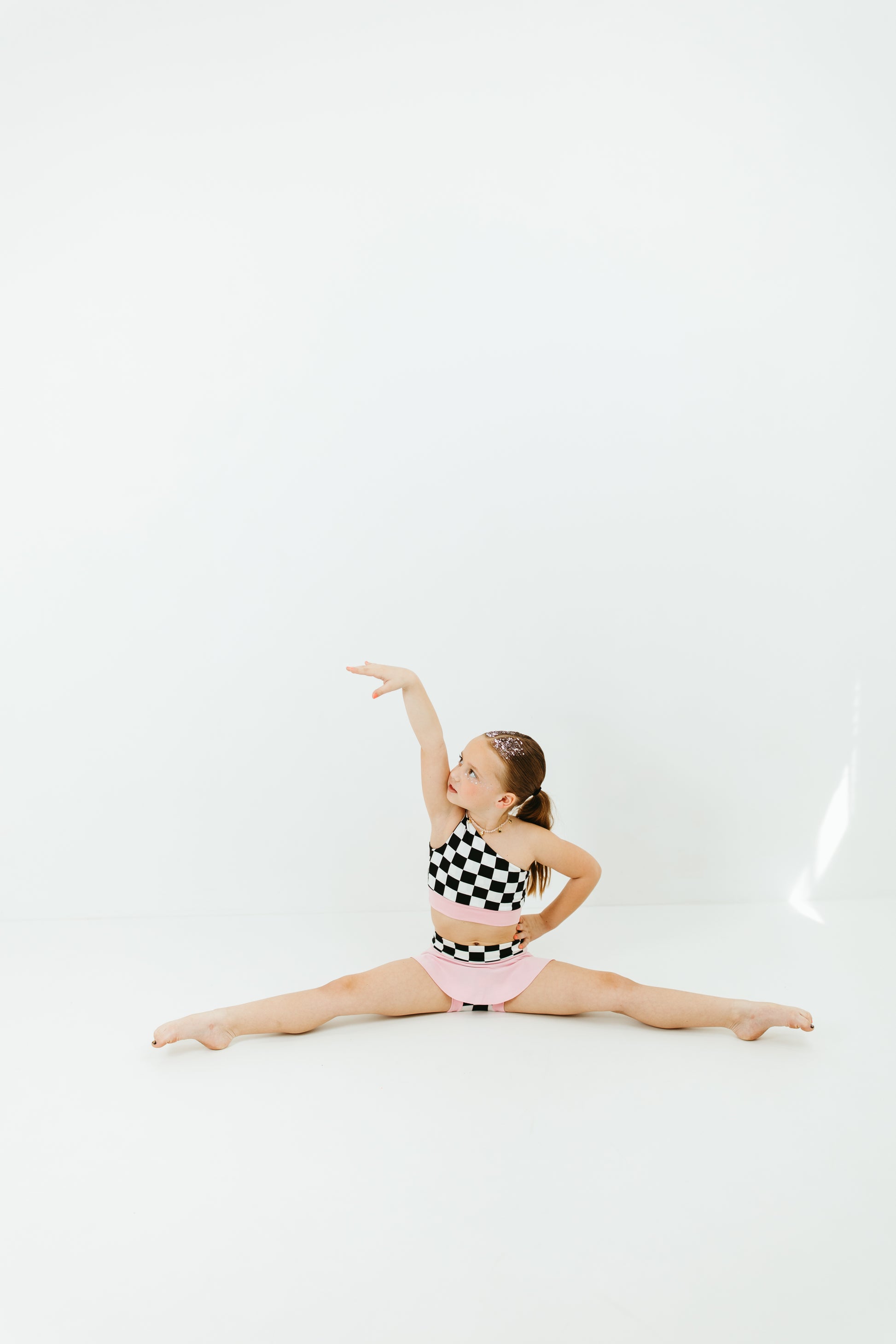 Featuring a one shoulder crop top and matching skirted bummie bottoms, this dance set is a versatile outfit for all of your dance, gymnastics, and tumbling needs! The top is fully lined and the bottoms have thick leg bands for complete booty coverage. Style together or separately for a variety of looks!
